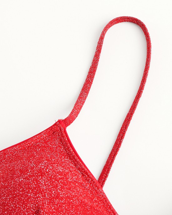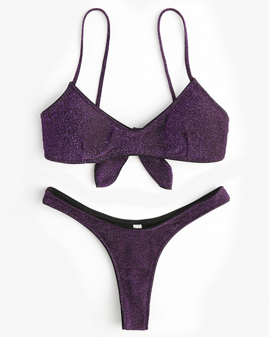 Women Solid Color Back Tie Spaghetti Straps Backless Swimwear Thong Bikini